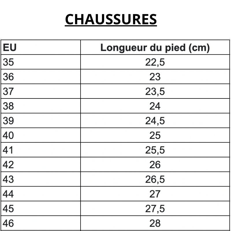 Pointure EU Longueur du pied (cm) Pointure US Pointure UK Pointure AU
